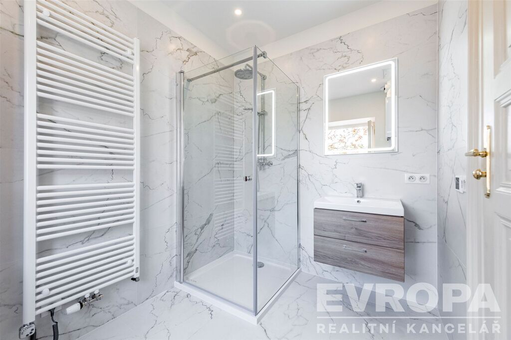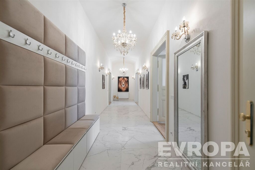 Kompletní rekonstrukce bytu dala vyniknout kráse původních architektonických prvků jako jsou dvoukřídlé interiérové dveře, parkety, velká špaletová okna a ostatní dobové doplňky. Velkoformátová dlažba z italského bílého mramoru, křišťálové lustry a nádherné vstupní dveře podtrhují výjimečnost a krásu tohoto bytu. Teplo a ohřev vody zajišťuje nový plynový kotel. V celém bytě je zavedena kabelová, internetová a telefonní síť. Zcela nová je elektroinstalace, koupelna, WC a rozvod topení. Byt má zcela nově zařízený interiér s moderní kuchyní ,na požádání dodáme ledničku a pračku.