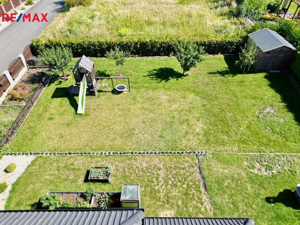 Velikost rohového (rohový = odstup od sousedů) pozemku 1047 m2 zajistí pohodu, klid a zachování soukromí. Zahrada je rovinatá a slunná a její velkost umožňuje různorodé využití. K domu vede dokončená, kvalitní a velkoryse dimenzovaná asfaltová komunikace. Okolní zástavbu tvoří již dokončené rodinné domy.