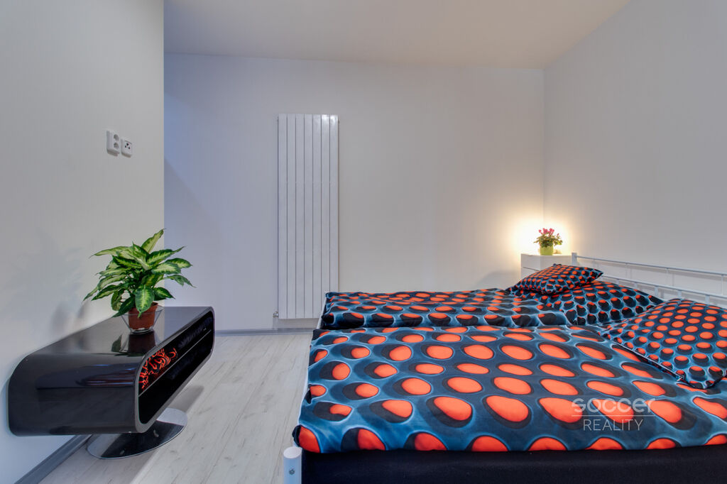 Dispozice bytu: velký obývací pokoj 23,65 m2 s kuchyňským koutem, krásná kuchyňská linka je bohatě vybavena (kuchyňský ostrůvek s dřezem a myčkou, chladnička s mrazákem, indukční varná deska + vestavná horkovzdušná trouba, mikrovlnka a digestoř – vše od Gorenje). Dále je v bytě ložnice 10,26 m2, koupelna 4 m2 (masážním sprchový kout, umyvadlo, toaleta a pisoár) a samostatné WC (umyvadlo, toaleta a pračka).