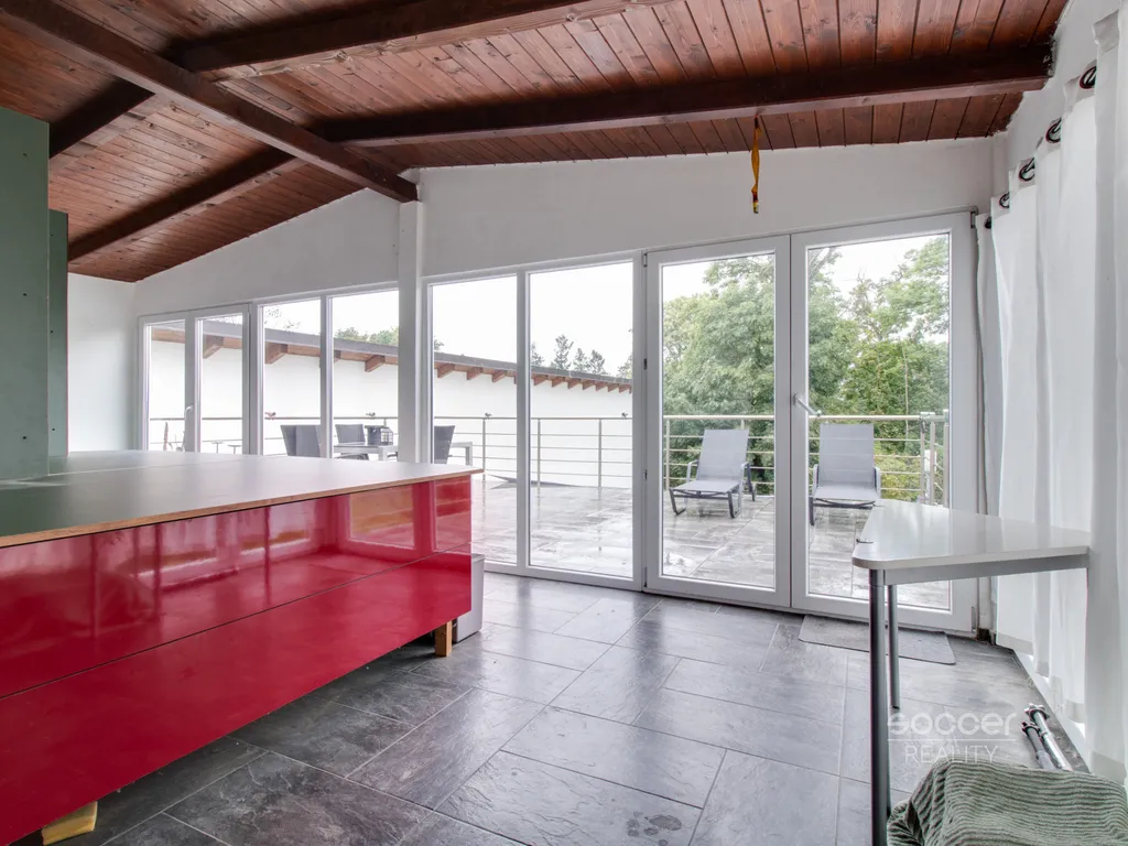 Na obývací pokoj navazuje krytá terasa 12,2 m2 a na ni terasa 32,2 m2, obě terasy jsou pouze pro byt.