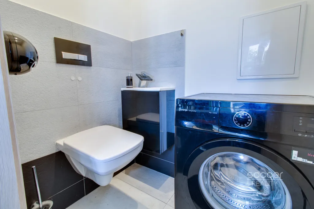 Dispozice bytu: velký obývací pokoj 23,65 m2 s kuchyňským koutem, krásná kuchyňská linka je bohatě vybavena (kuchyňský ostrůvek s dřezem a myčkou, chladnička s mrazákem, indukční varná deska, mikrovlnka a digestoř – vše od Gorenje). Dále je v bytě ložnice 10,26 m2, koupelna 4 m2 (masážním sprchový kout, umyvadlo, toaleta a pisoár) a samostatné WC (umyvadlo, toaleta a pračka).