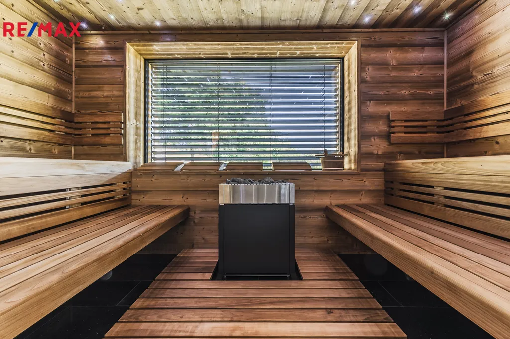 Designová sauna a kuchyně Schüller s masivním jídelním stolem