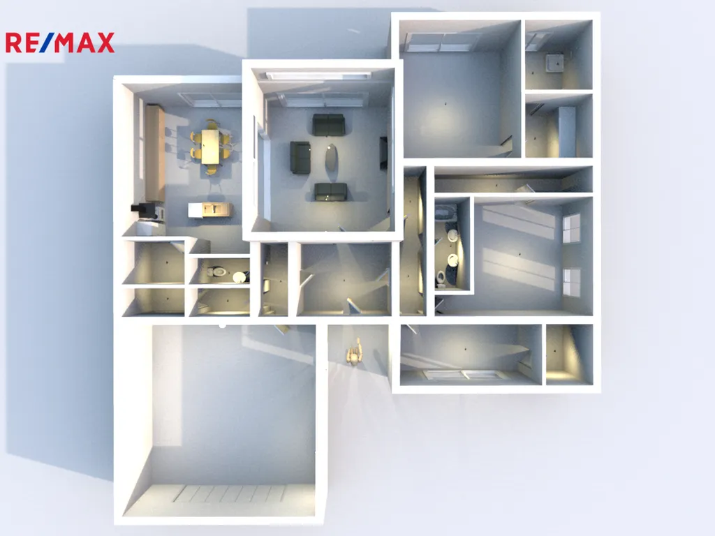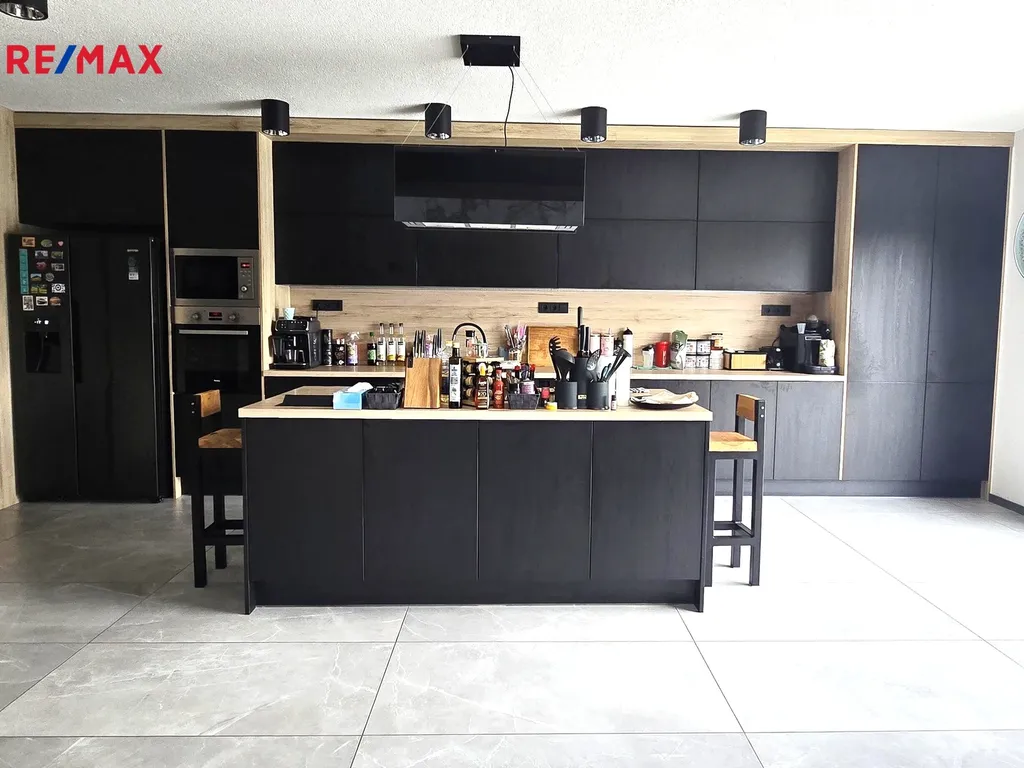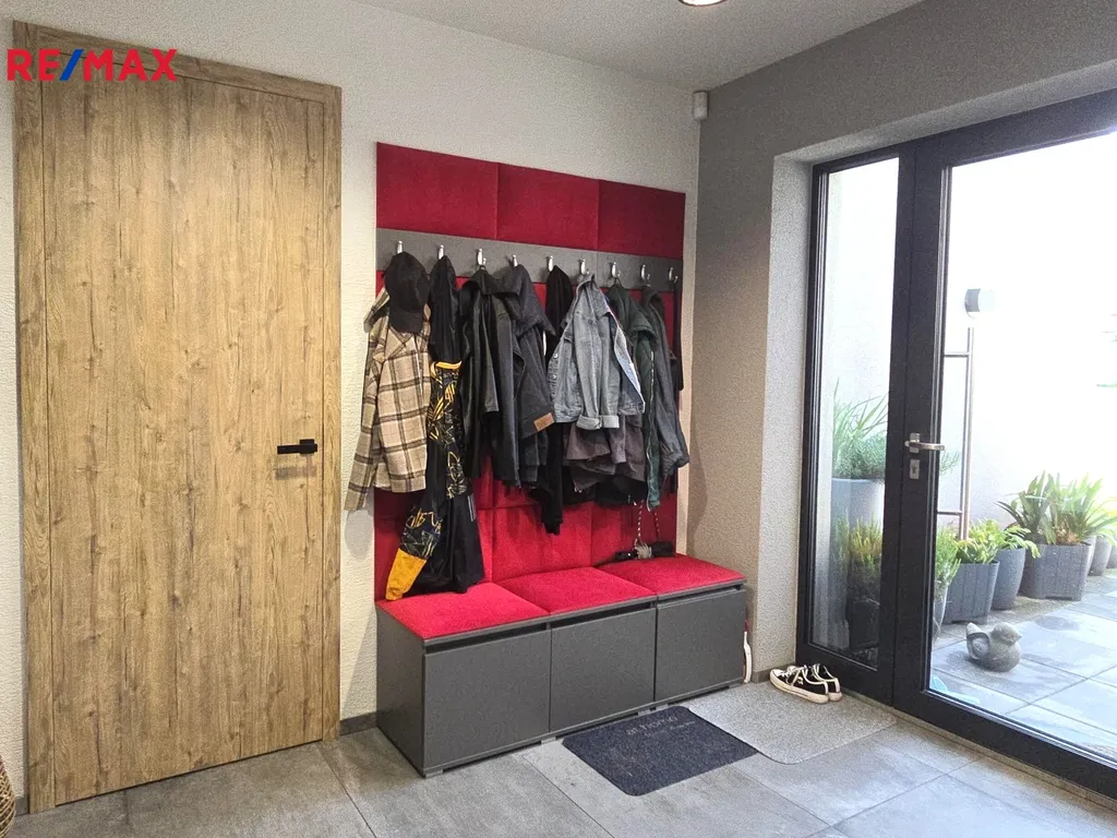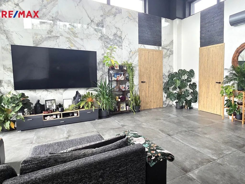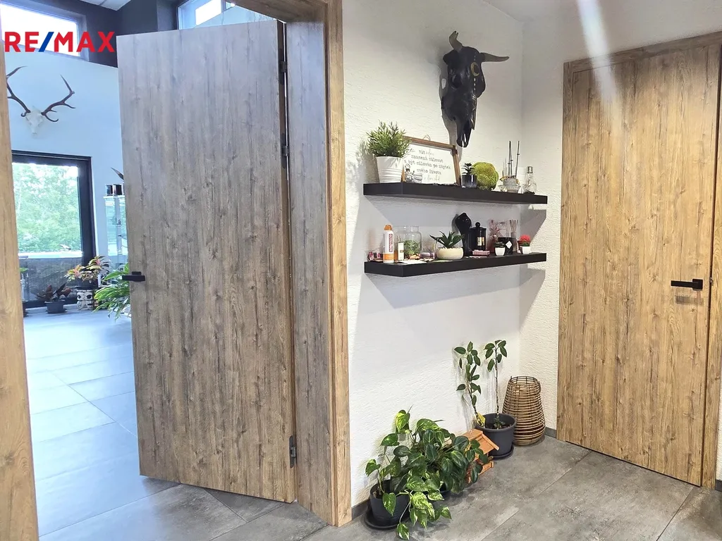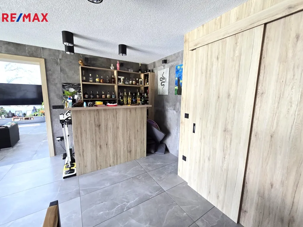Nemovitost se skládá ze 3 prostorných pokojů s vlastní šatnou, netradičně vyvýšeným obývacím pokojem se světlou výškou 5 m, 2 koupelnami, 3 WC, kuchyní s jídelnou a barem, spížkou a 2 technickými místnostmi. Dvojgaráž se vstupem přímo do domu, v současnosti využita jako posilovna pána domu, je další výhodou této nemovitosti.