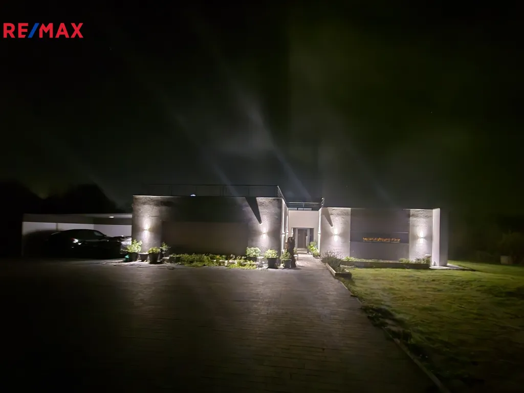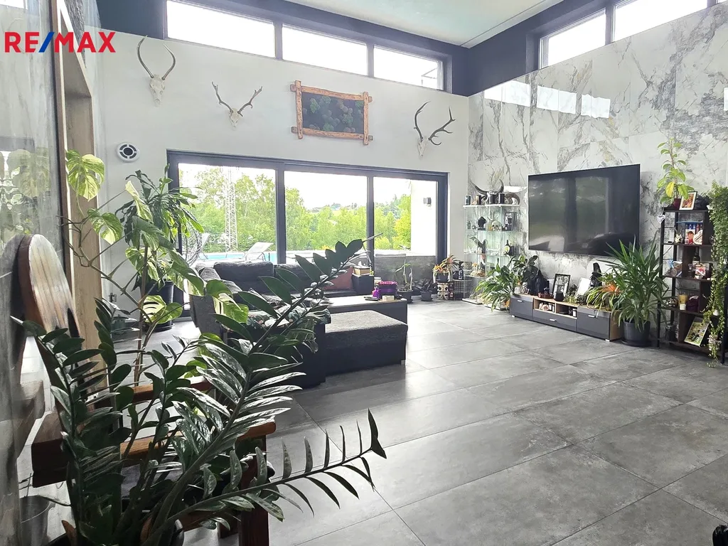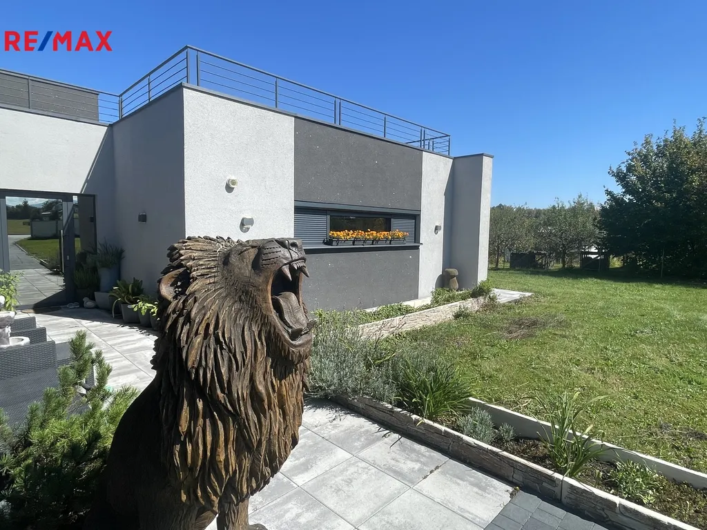 Parkování zajištěno krytým stáním na zpevněných plochách u domu. Klid a soukromí majitelů je umožněno díky velkorysým rozměrům přiléhajícího a oploceného pozemku o velikosti 12829 m², který nabízí široké možnosti pro venkovní aktivity či rodinné oslavy. V této oáze klidu v blízkosti přírody můžete zažívat nezapomenutelné okamžiky v souvislosti s relaxací na terase nebo osvěžením v zapuštěném bazénu o ploše 50 m ² se slanou vodou a zabudovaným solinátorem, který se stará o dezinfekci a čistotu vody. Netradiční řešení nabízí i vybudované samostatné schodiště v exteriéru na pochozí rovnou střechu se zábradlím, která je připravena k vybudování střešní terasy či zelené přírodní střechy s úžasnými výhledy do krajiny. Možnost instalace solárních panelů. Velkoformátová okna s automatizovanými venkovními roletami vždy vyřeší potřeby stínění či osvětlení. Nemovitost je navržena jako chytrý dům s technologií Loxone, což je špičkový systém chytré domácnosti, který umožňuje plně automatizované ovládání osvětlení, vytápění, bezpečnostních systémů, venkovních žaluzií, klimatizace a dalších zařízení prostřednictvím aplikací chytrých telefonů apod. Rekuperace zajišťuje optimalizaci vnitřního prostředí a zvyšuje energetickou efektivitu. Nemovitost splňuje nízkoenergetický standard, což zajišťuje nejen komfort, ale také ekonomiku v provozu. Pro vytápění je využíváno podlahové vytápění prostřednictvím topných fólií, a v letních měsících chladí klimatizace. Vše pod dohledem chytré domácnosti Loxone s ovládáním na dálku i mimo domov. Kamerový systém se podílí na pocitu bezpečí a soukromí. Dům je napojen na veřejný vodovod, odpad je řešen septikem.