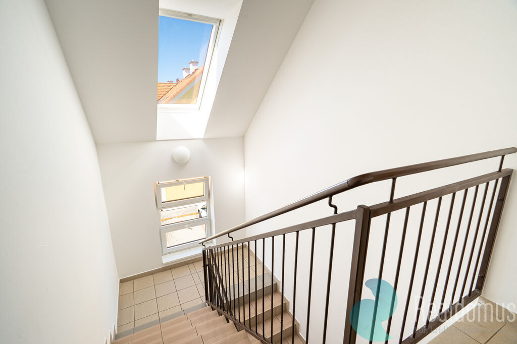 Byt se nachází ve druhém patře/podkroví malého zděného domu a nabízí komfortní a klidné bydlení s výbornou dostupností do města. Dispozičně je byt velmi prakticky řešen, najdeme zde velkorysý obývací pokoj s moderním kuchyňským koutem (31,6 m²), dvě ložnice (19,7 m² a 15,63 m²), koupelnu s vanou (4,4 m²), samostatnou toaletu (1,87 m²) a předsíň (7,7 m²). Kuchyňská linka je vybavena troubou, varnou deskou, digestoří a mikrovlnnou troubou.