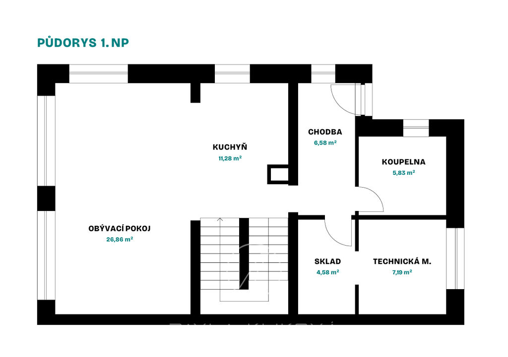 Dům je v prvním podlaží členěn na vstupní chodbu, WC s koupelnou, technickou místnost a obývací pokoj s kuchyňským koutem a spíží. Krásný prosklený prostor s výhledem na přelivový bazén 4,4 m2 x 3,4 m2. Velká francouzská okna nám umožní vstoupit přímo na terasu k bazénu a dále do zahrady. V patře najdeme 4 ložnice, koupelnu a samostatné WC.