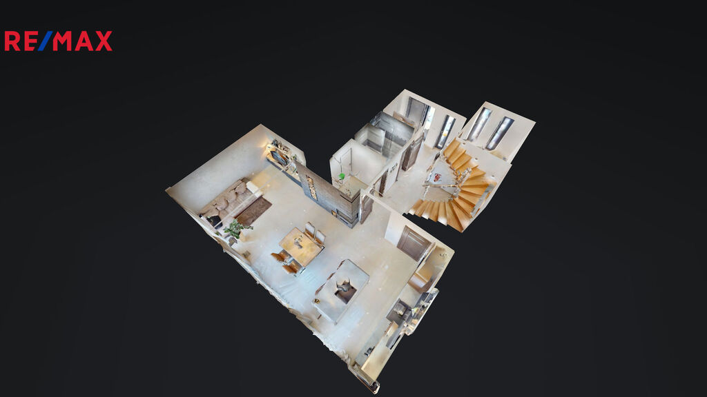 Je prakticky dispozičně řešen: v přízemí je vstupní hala, prostorný obývací pokoj s krbem na dřevo a přímým vstupem na terasu ktera ma 21m2 a zahradu, kompletně vybavená kuchyň má i spíž na uskladněni potravin. Koupelna se sprchovým koutem, umyvadlem a toaletou. Dále je zde další pokoj (pracovna, pokoj pro hosty), technická místnost kde je umístěn kondenzační plynový kotel Junkers a odtud je vstup do garáže. Plocha garáže je 18 m2.