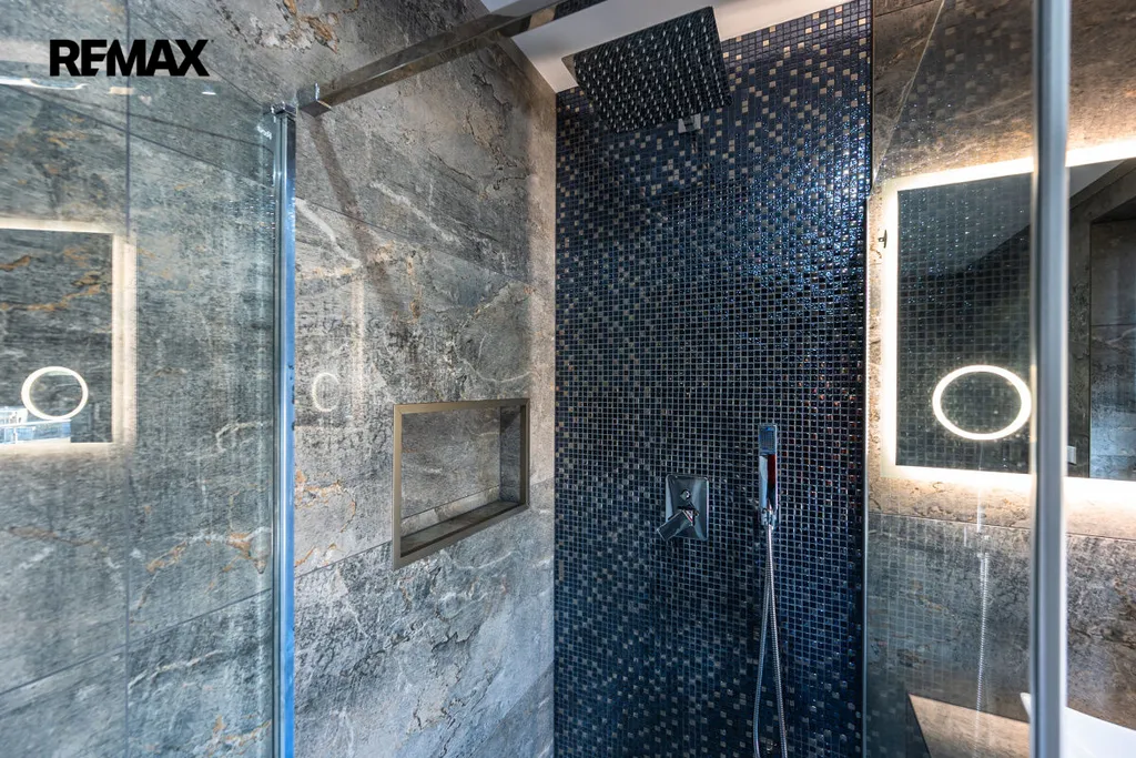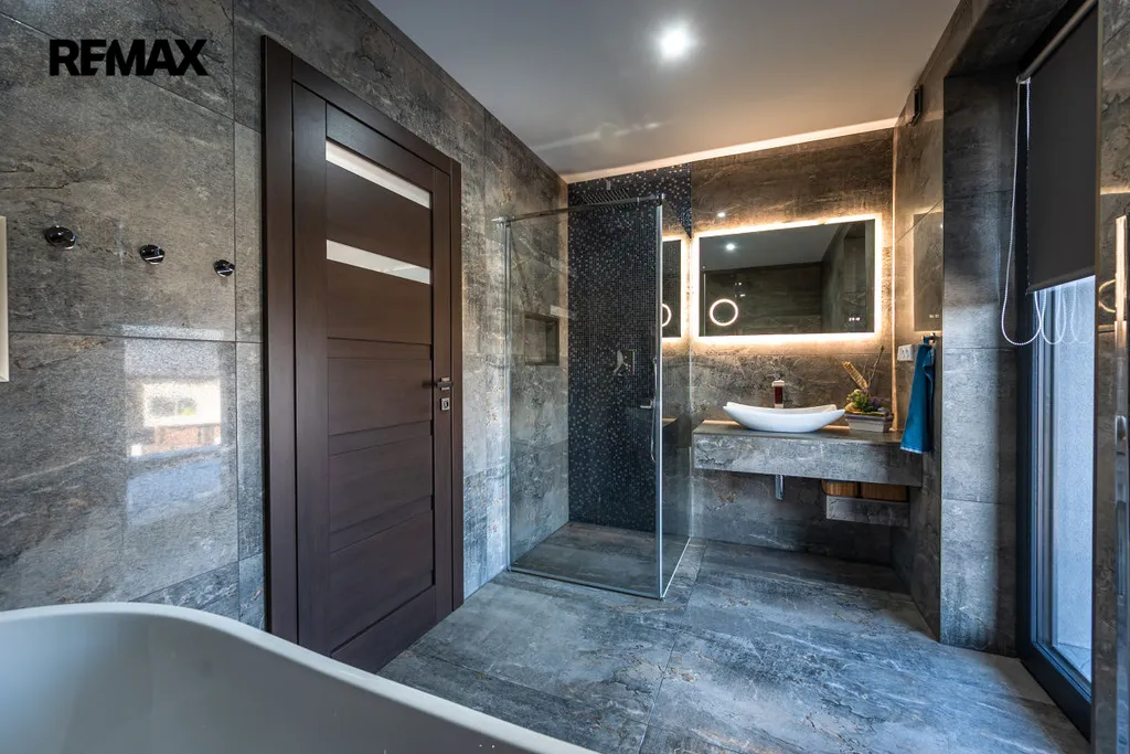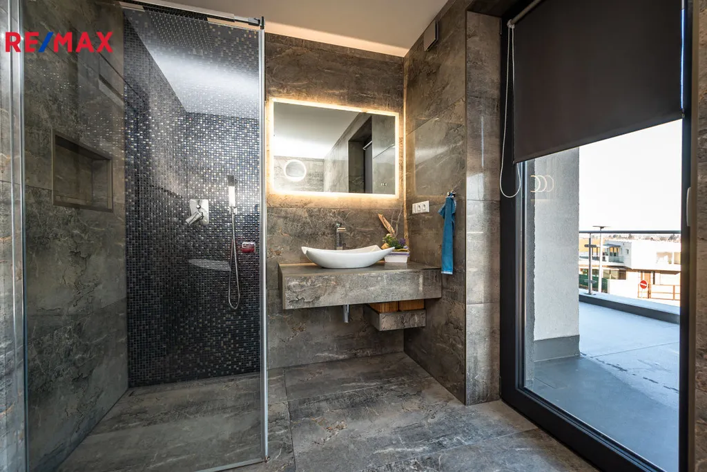 Koupelna má vanu, sprchový kout, umyvadlo. WC samostatné, umyvadlo a také prostor na pračku a sušičku.