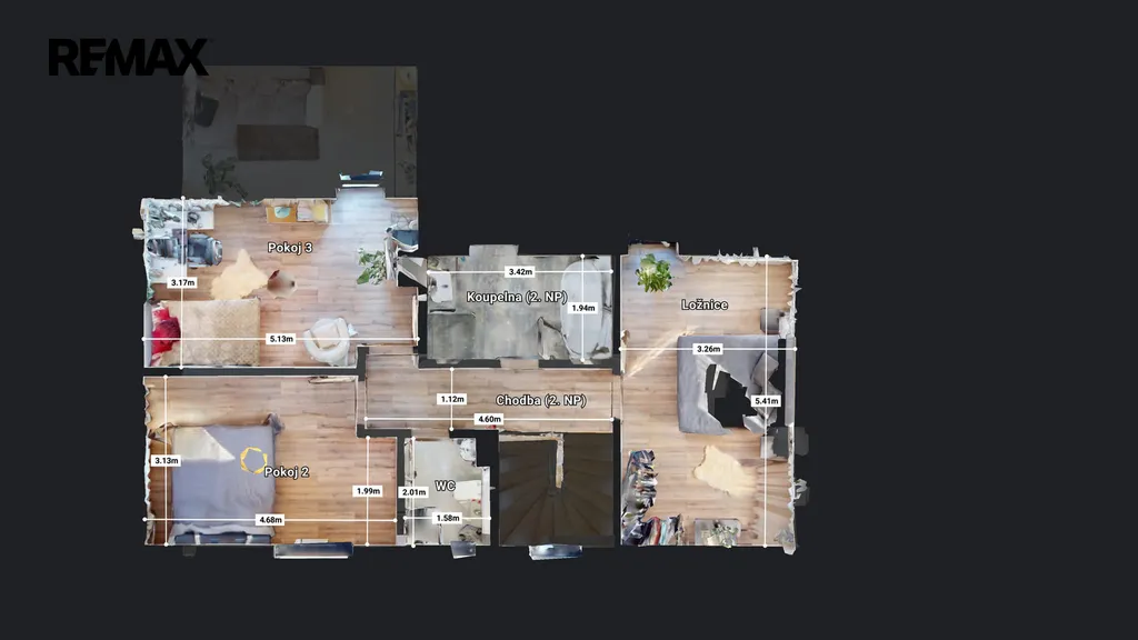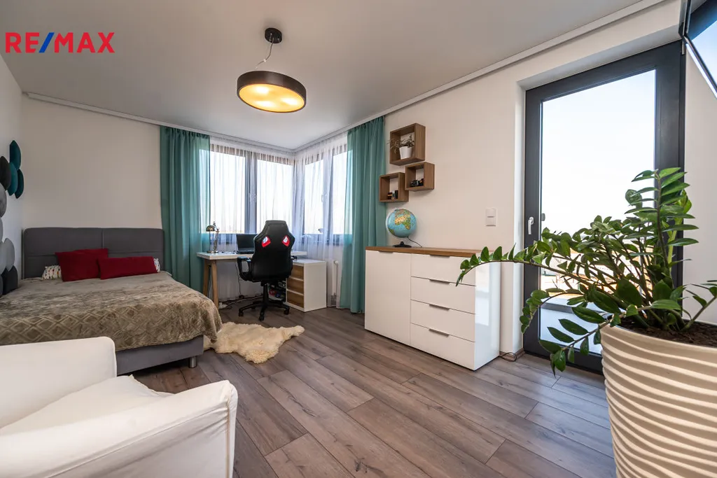 V prvním patře jsou tři neprůchozí ložnice, ze dvou ložnic je vstup na terasu. Terasa ma 31,4 m2.