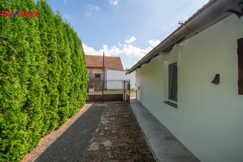 Pozemek a technické zázemí nemovitosti je napojené na obecní vodovod, kanalizaci, plyn i elektřinu. Na pozemku se nachází také studna a větší dřevěná kůlna. Menší zahrada je osázena vzrostlými thujemi, které zajišťují soukromí. Přístup na pozemek je možný brankou pro pěší nebo vjezdem pro auto. Před domem je pozemek s věcným břemenem chůze a jízdy pro zajištění přístupu k nemovitosti. Vedle domu je zbudované nové menší parkoviště. Ulice je jinak slepá (neprůjezdná) a díky tomu je zde klid.