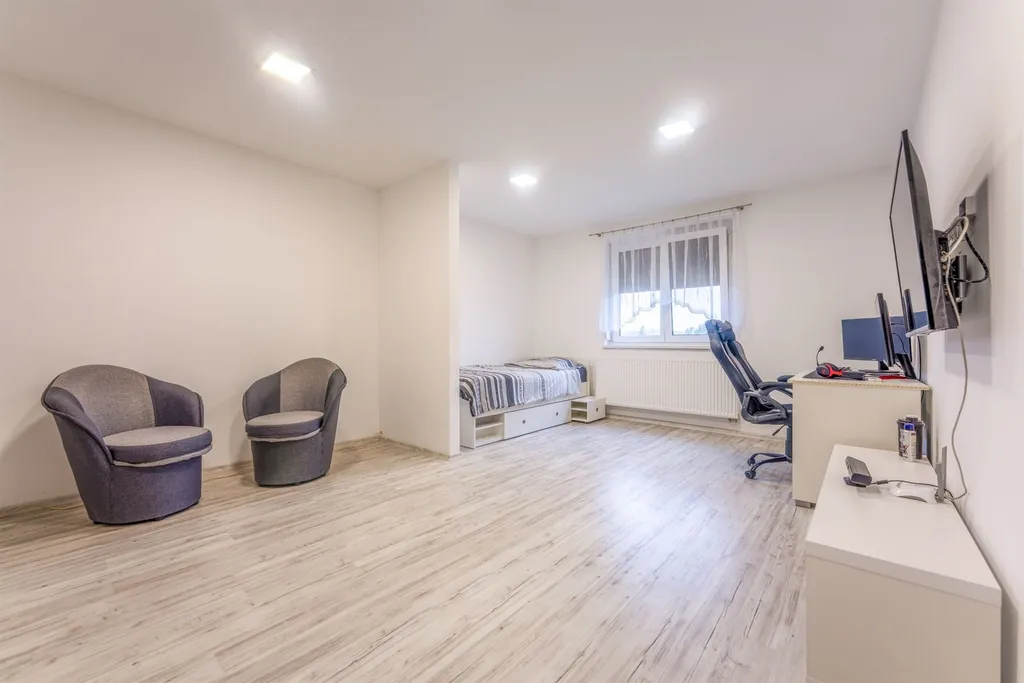 Další praktické prostory nalezneme v suterénu domu, kde je k dispozici společenská místnost, kuchyňský kout se zázemím pro pračku a sušičku, samostatná toaleta, posilovna, dílna a technická místnost.