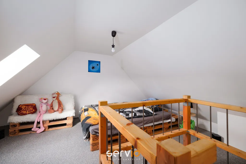 2.NP - 109,43 m2 (podkroví s vysokým úkosem, který nepřekáží užívání prostor) - 3 pokoje (z nichž jeden je 2 patrový - mezonetový), prostorná centrální hala využívaná jako druhý obývací pokoj (zde je možnost připojení druhé kuchyně), koupelna s WC, komora, terasa (6,47 m2).