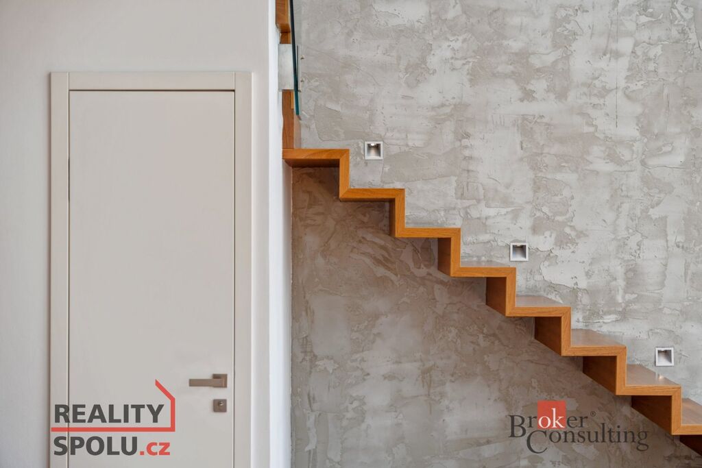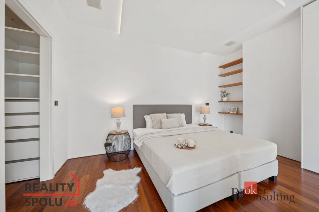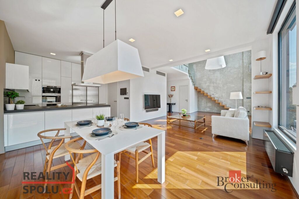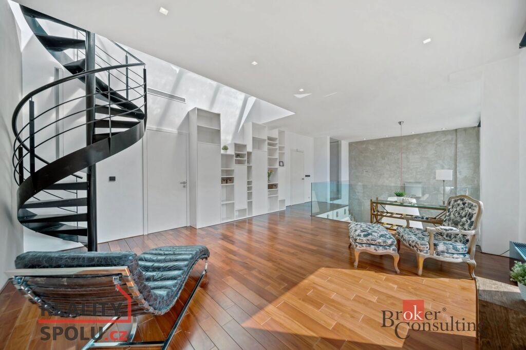Loftový byt 3+kk se dvěma koupelnami ve 2 patrech o celkové ploše 222 m2 včetně terasy s exkluzivním výhledem. Podlahová plocha bytu činí 142,82 m2 a střešní terasa 78,81m2. Byt se nachází v 6. nadzemním podlaží bytového domu. Vstupní prostorná chodba o výměře 5,81 m2 vede do koupelny se sprchovým koutem o výměře 4,2 m2, šatny 3,76 m2 a do hlavní části – obývacího pokoje s kuchyňským koutem o výměře 60,36 m2. Přes schody umístěné v obývacím pokoji se dostaneme do dalšího patra, kde se nachází galerie o výměře 51,22m2 s ložnicí, šatnou 3,86m2 a koupelnou 10,55m2. Z patra se přes schodiště dostaneme na úžasnou střešní terasu o výměře 78,81m2 s překrásnými výhledy na Prahu a Pražský hrad.