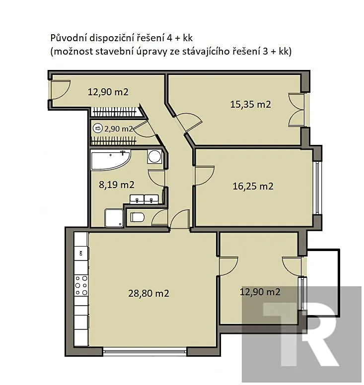 Devizou je možnost praktického přizpůsobení dispozice na původní 4 + kk. Porovnání půdorysů najdete ve fotodokumentaci.