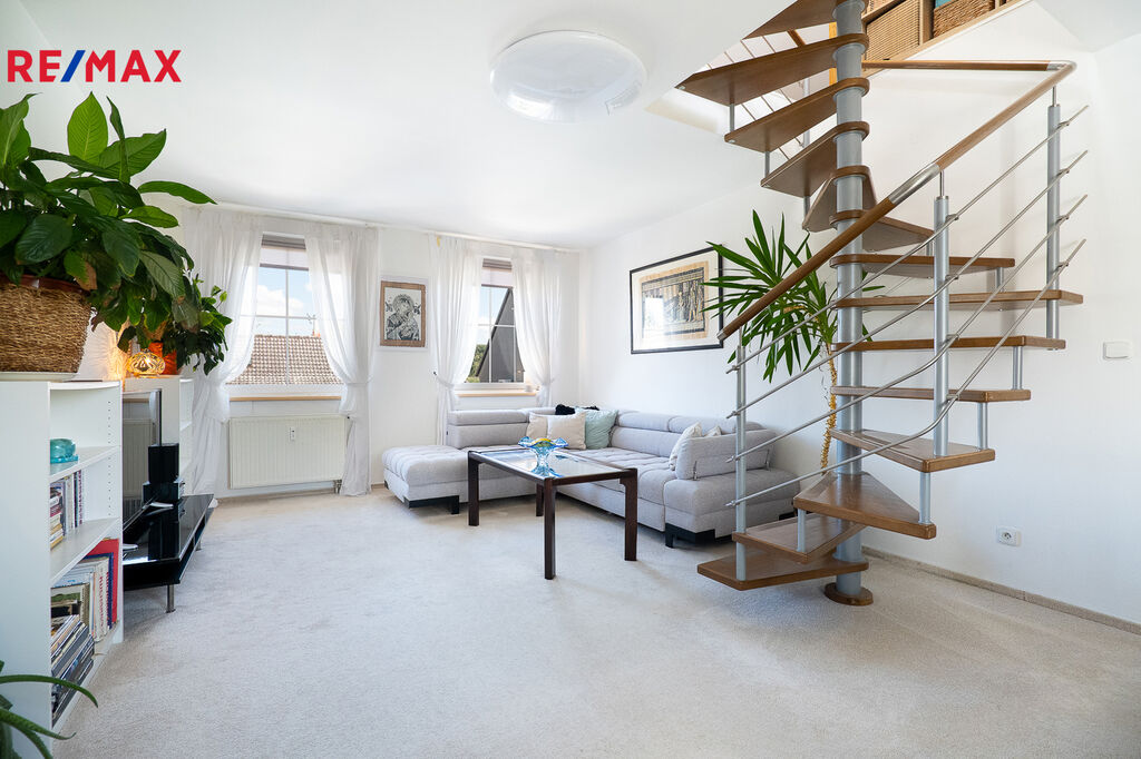 Byt je situován v prvním podlaží a v podkroví.  Přístup vede přes schodiště a zastřešenou pavlač, vstup vede z předsíně dok prostorné obývací místnosti (24,96 m²)  spojené s kuchyní (11,5 m²) s oknem a novou kuchyňskou linkou (r. 2017) kompletně vybavenou spotřebiči. Na tomto podlaží se nachází ještě prostorná šatna (10 m2)  a ložnice (14,78 m2). Komfort poskytuje moderní koupelna se sprchovým koutem, umyvadlem, vestavěným nábytkem a infrasaunou.