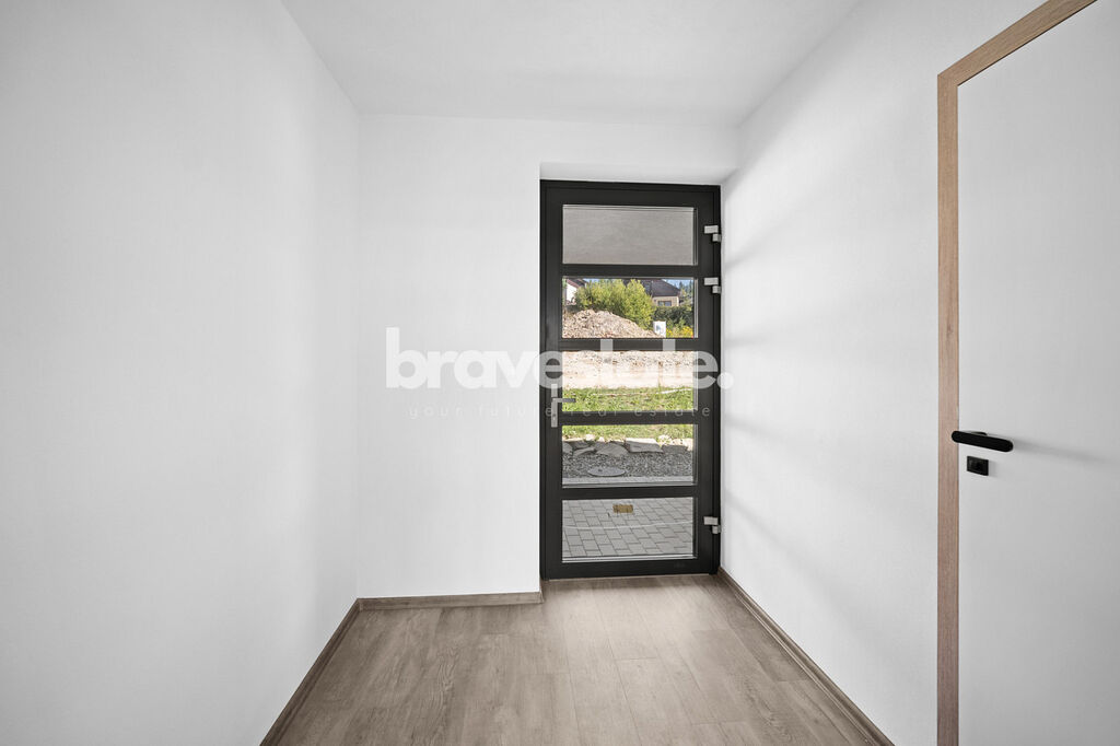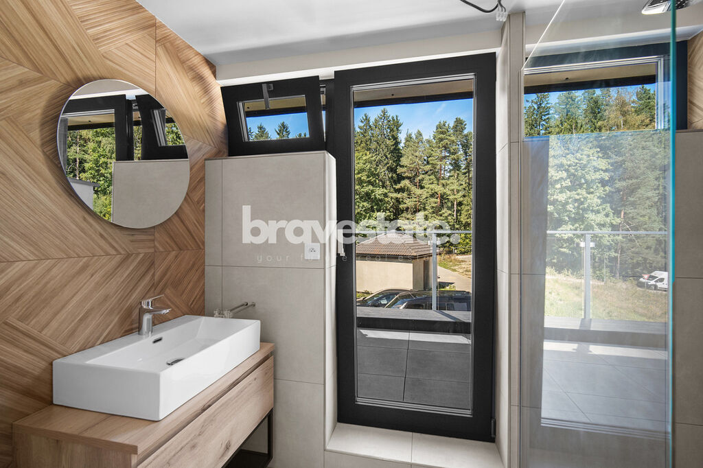 Vysoký standard domu zahrnuje dřevěná okna v antracitové barvě včetně HS portálů, s trojskly. Smart dálkové otevírání hlavních dveří (protipožární) pomocí číselného kódu. Kvalitní vinylové podlahy v dekoru přírodního dřeva. V koupelně a na toaletě, značky Geberit, je položená keramická rektifikovaná dlažba doplněná keramickými obklady. Dveře jsou spolu obložkovými zárubněmi od renomované značky SAPELI. Designový ráz domu zajišťuje venkovní obklad z pravého dřeva. Vytápění domu je pomocí tepelného čerpadla.