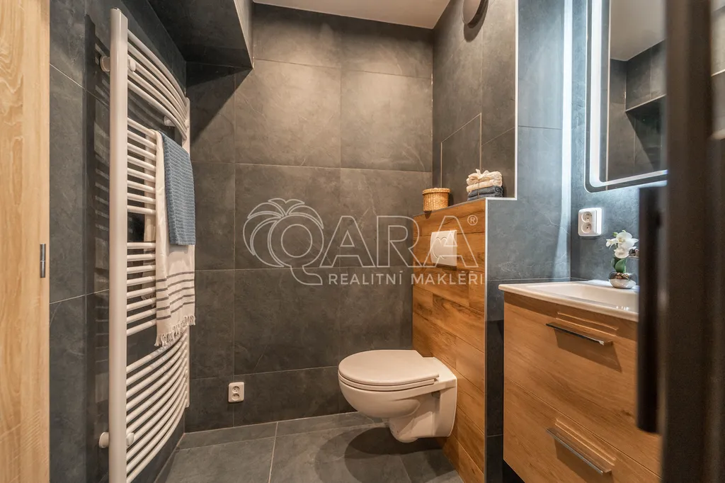 Vytápění a ohřev vody zajišťuje úsporný elektrokotel se zásobníkem. Vysoce kvalitní vinylové podlahy v celém bytě poskytují příjemný komfort. Koupelna je obložena velkoformátovou dlažbou s nadčasovým designem.