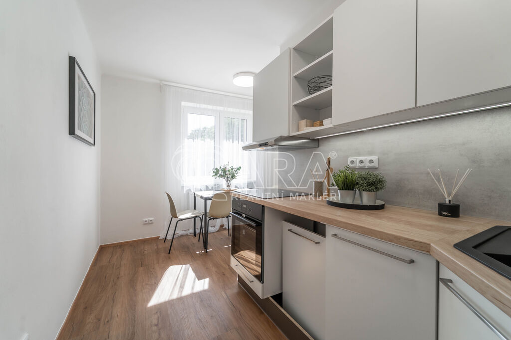 Kompletně nový interiér bytu byl navržen s důrazem na detail a kvalitu s využitím nejmodernějších technologií tak, aby splňoval vysoké požadavky na pohodlné a praktické bydlení. Otevřený koncept obývacího pokoje a kuchyně vytváří příjemný prostor pro rodinné setkávání nebo večírky s vašimi přáteli. Moderní kuchyňská linka je vybavena nejnovějšími spotřebiči včetně přípravy na vestavěnou pračku a nabízí dostatek úložného prostoru pro všechny vaše kulinářské potřeby. Navržena byla ve spolupráci s renomovanou značkou Oresi a je na ni 10 let záruka.