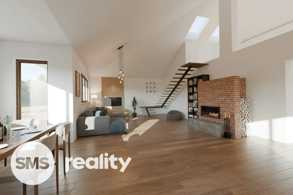 V přízemí domu se nachází velkorysý obývací pokoj s kuchyní a jídelnou, tři ložnice, praktická spíž a technická místnost. Podkroví nabízí další obytný prostor vhodný například pro pracovnu nebo pokoj pro hosty. Součástí domu je také garáž, která pojme i větší vůz.