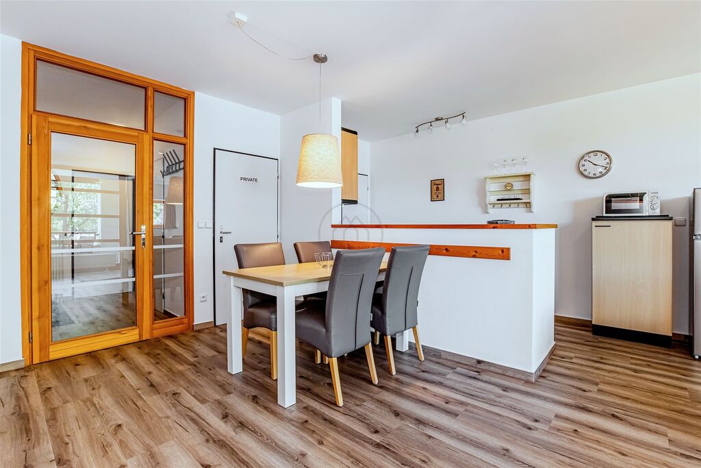 Jedná se o funkčně řešený apartmán 3+kk, ze zádveří je přístupná koupelna, samostatné WC a dvě ložnice. Dále prostor navazuje do obývacího pokoje spojeného s kuchyní a vstupem na balkon s jedinečným výhledem na plachetnice a vodní plochu.