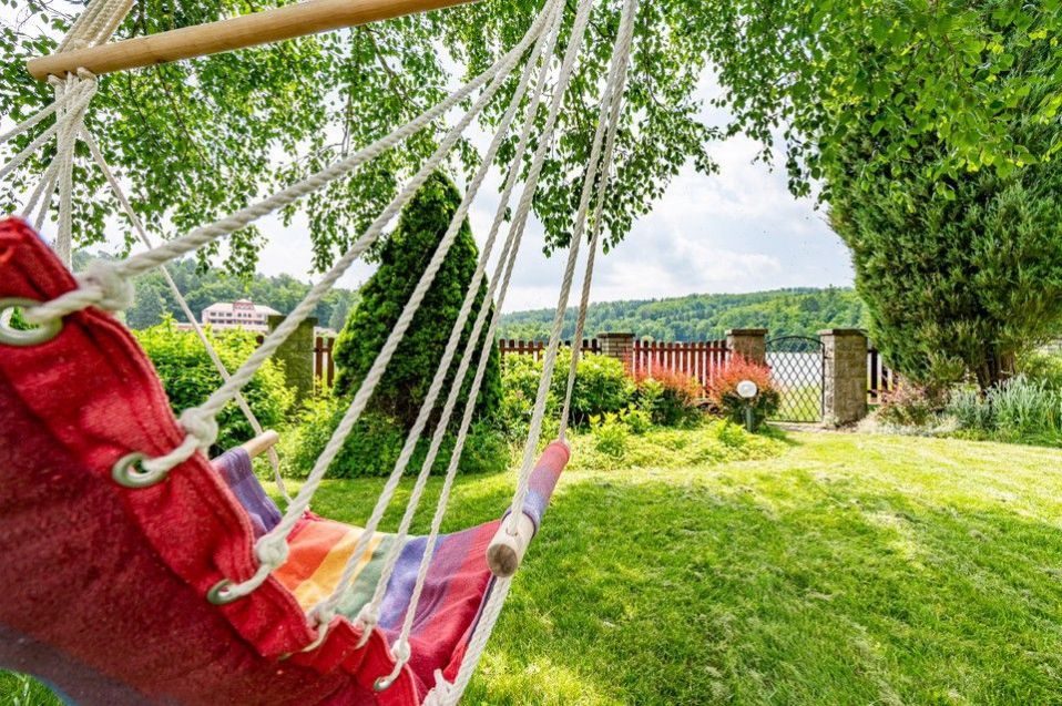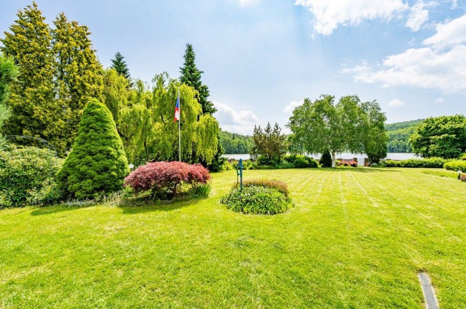 Mimořádně prostorná a okouzlující zahrada se vzrostlými stromy poskytuje soukromí a navazuje mimořádný pocit  nerušeného prostředí a intimity. Pozemek bezprostředně sousedí s rybníkem a má k němu soukromý vstup.