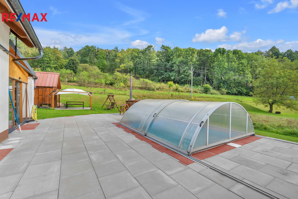K odpočinku a relaxaci slouží sauna, koupací sud a venkovní bazén o rozměrech 3 × 4 m s hloubkou 1,2 m. Součástí domu je také malý sklípek. Moderním prvkem je nabíječka pro elektromobily, která zvyšuje komfort užívání. Odpad je řešen tříkomorovým septikem s filtrací. Měsíční provozní náklady činí zhruba 3 000 Kč.