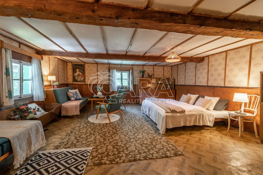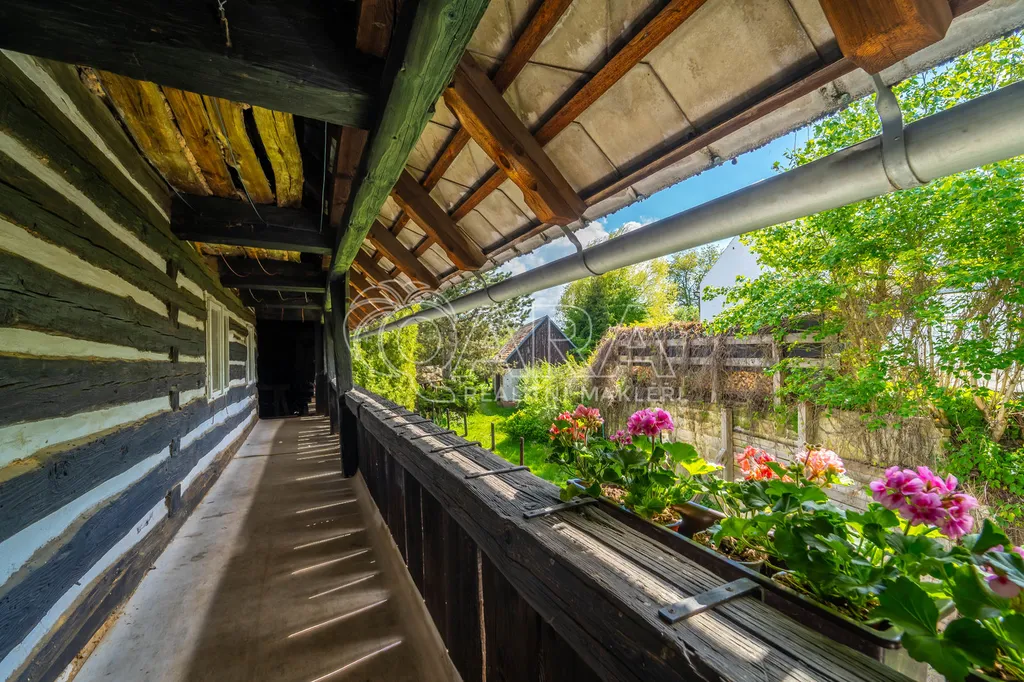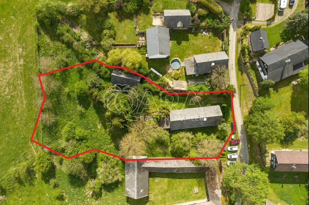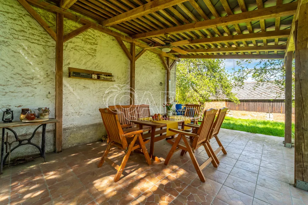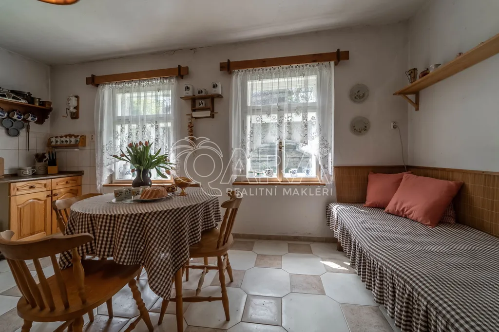 Stylová chalupa s garáží a samostatnou stodolou stojí ve slepé ulici situované na konci obce, na lehce svažitém pozemku o celkové výměře 2.727 m2.