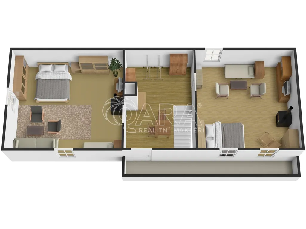 V přízemí najdeme rozlehlý obývací pokoj s otevřeným krbem, samostatnou kuchyň s jídelnou a v patře 2 velké ložnice s pavlačí. Dalším místem k realizaci vašich nápadů je půda, která propojuje dům s prostorem nad garáží.