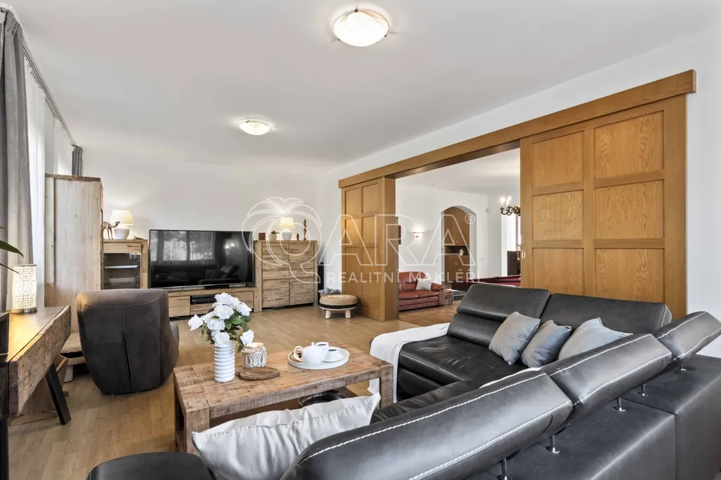 Uvnitř vás čeká pět samostatných a prostorných ložnic, více než šedesátimetrový obývací pokoj, rozdělený na klidovou a společenskou zónu s kulečníkovým stolem a krbem a v suterénu najdete ještě i fitness a společenskou místnost, kde se potkává rodina i přátelé.
