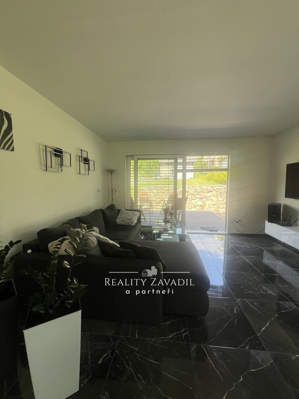 Při vstupu vás přivítá praktické zádveří, odkud se dostanete do prostorného obývacího pokoje s přímým vstupem na terasu. Obývací prostor je propojen s moderní kuchyní do tvaru „U“ s vestavěnými spotřebiči.