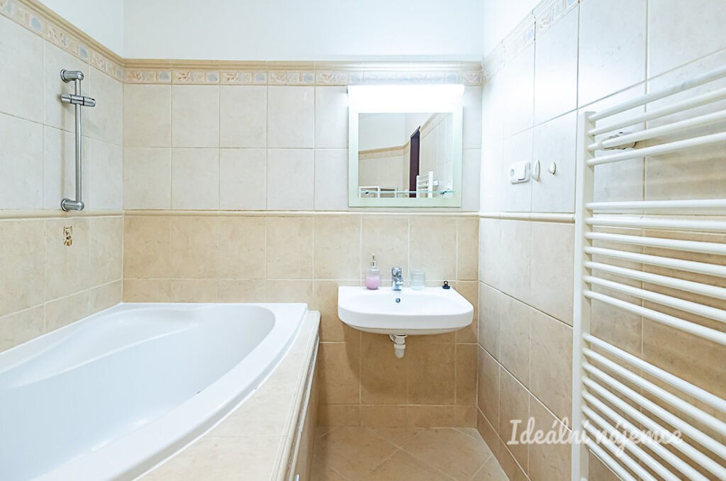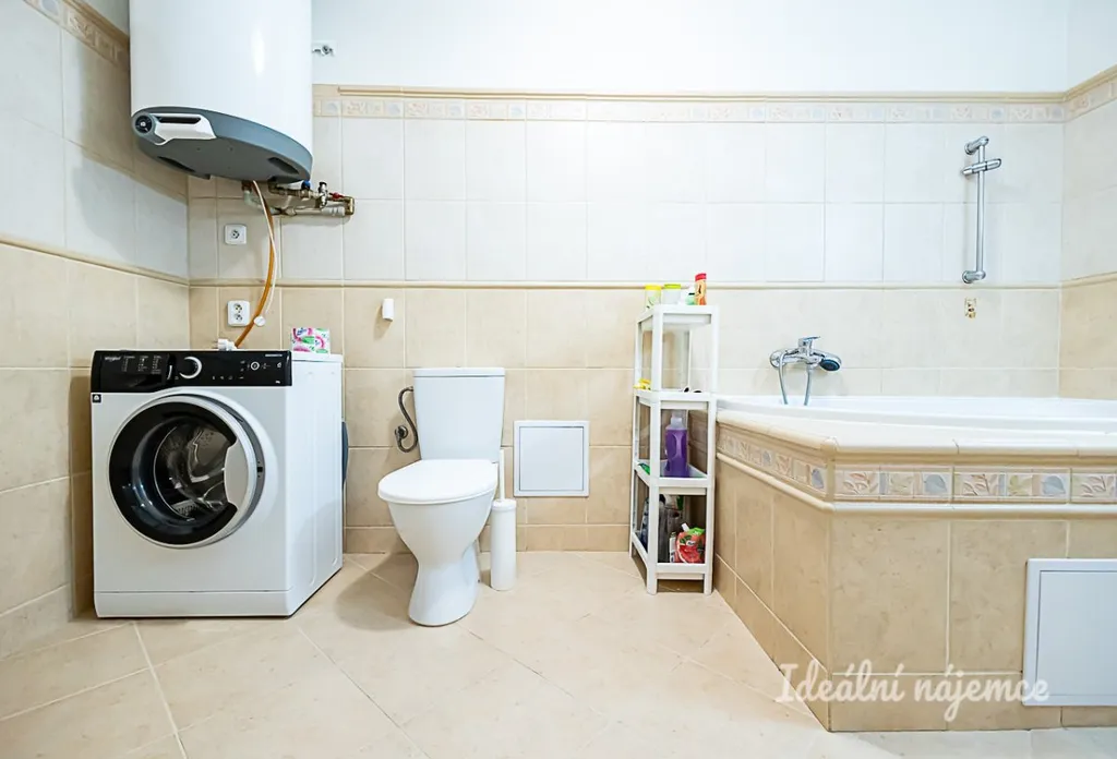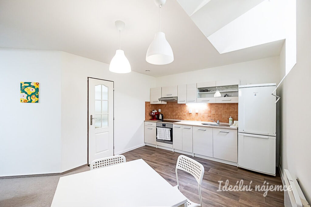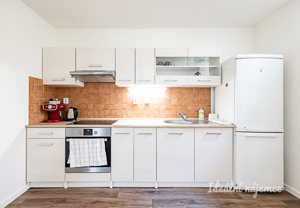 Byt je plně vybavený a připravený k okamžitému nastěhování. Kuchyňská část disponuje lednicí s mrazákem, elektrickou troubou, indukční varnou deskou, digestoří a jídelním koutem. Obytný prostor je zařízen pohodlným posezením, postelí, konferenčním stolkem a televizí. Koupelna nabízí vanu, umyvadlo, toaletu a pračku. Praktickým doplňkem je také samostatná šatna.