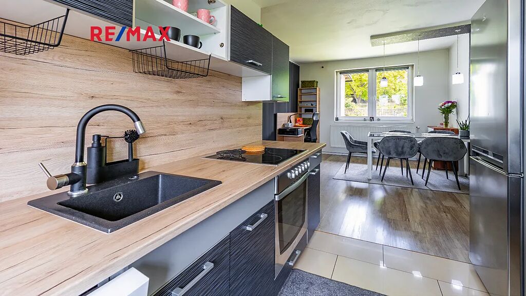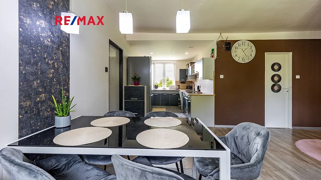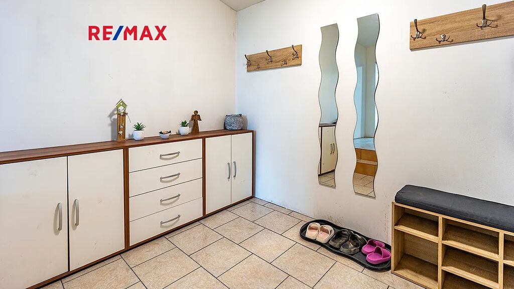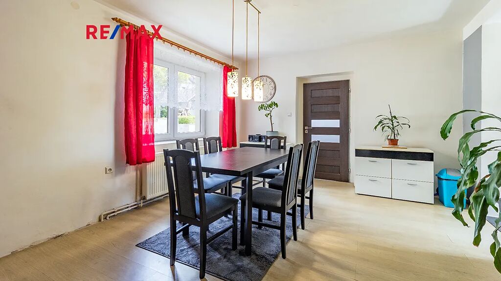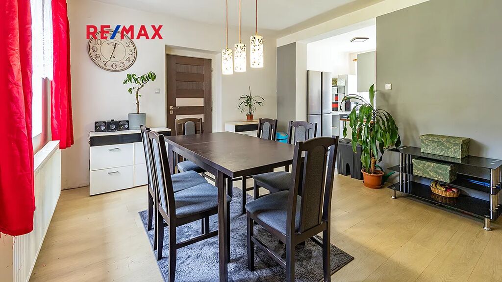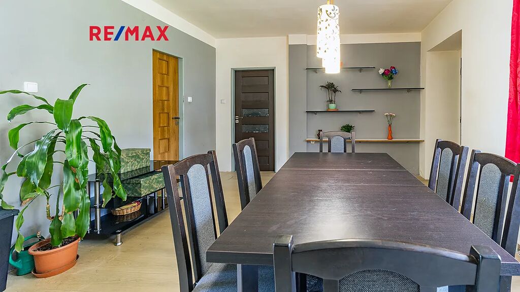 V přízemí se nachází samostatná bytová jednotka s prostornou jídelnou propojenou s kuchyňským koutem, dále pak průchozí obývací pokoj, navazující pokoj a ložnice, koupelna spojená s wc. Součástí této části domu je také technické zázemí – násypkový kotel na tuhá paliva, tři bojlery napojené na solární panely pro úsporný ohřev vody, dílna, úložný prostor pod schody a garáž. Vše je vzájemně propojené a pohodlně průchozí, což zajišťuje praktické a efektivní využití každého metru.