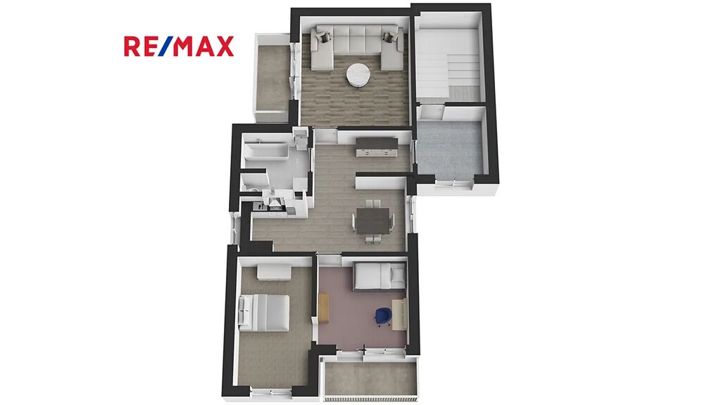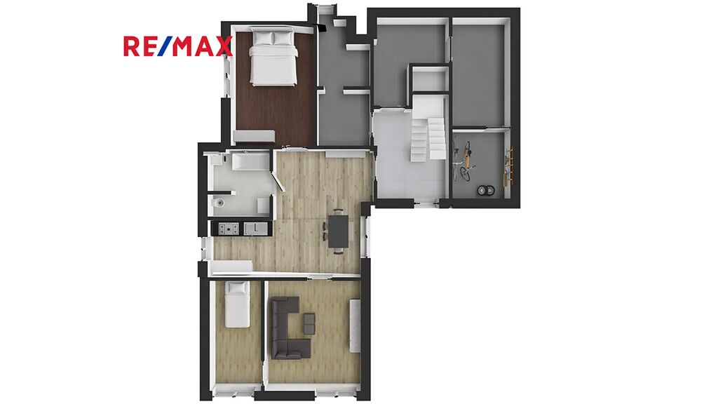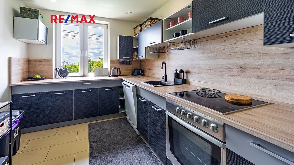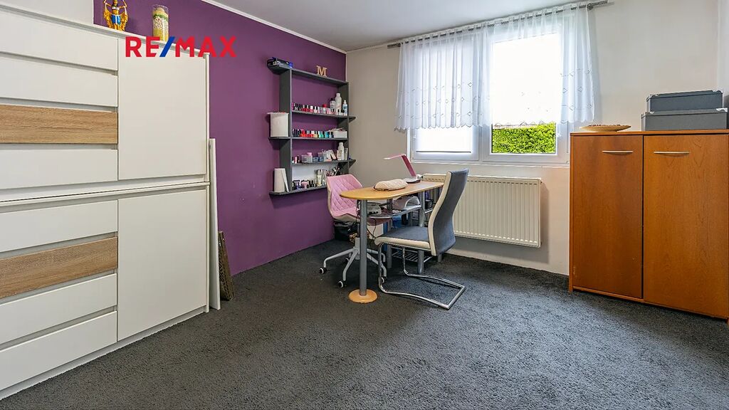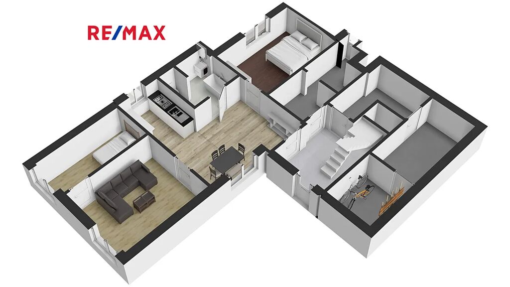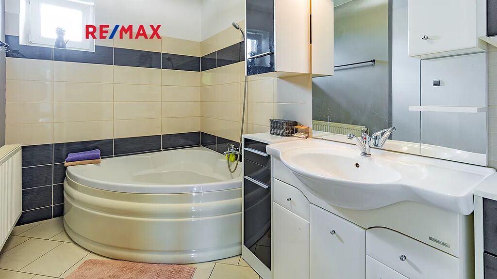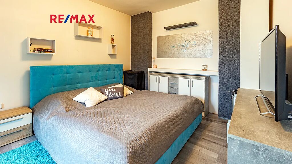 V přízemí se nachází samostatná bytová jednotka s prostornou jídelnou propojenou s kuchyňským koutem, dále pak průchozí obývací pokoj, navazující pokoj a ložnice, koupelna spojená s wc. Součástí této části domu je také technické zázemí – násypkový kotel na tuhá paliva, tři bojlery napojené na solární panely pro úsporný ohřev vody, dílna, úložný prostor pod schody a garáž. Vše je vzájemně propojené a pohodlně průchozí, což zajišťuje praktické a efektivní využití každého metru.