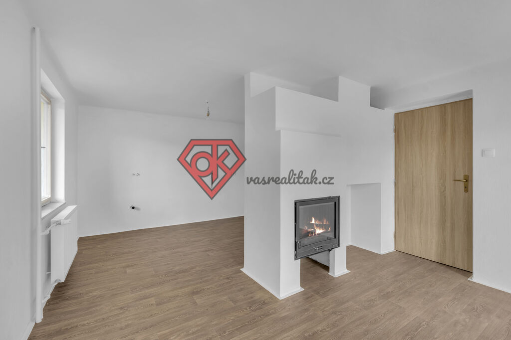 1.NP - prostorný obývací pokoj s krbovými kamny a přípravou na kuchyň, pokoj, vstupní chodba, koupelna, toaleta a technická místnost