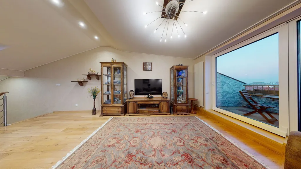 Dominantou bytu je prostorný obývací pokoj s moderní kuchyní cca 33 m and sup2; a vstupem na balkon / terasu cca 7,5 m and sup2;, odkud se otevírá jedinečný výhled na město.