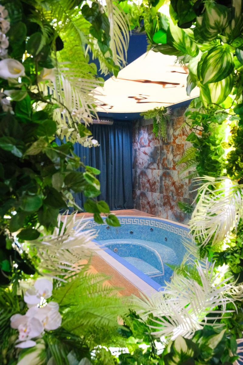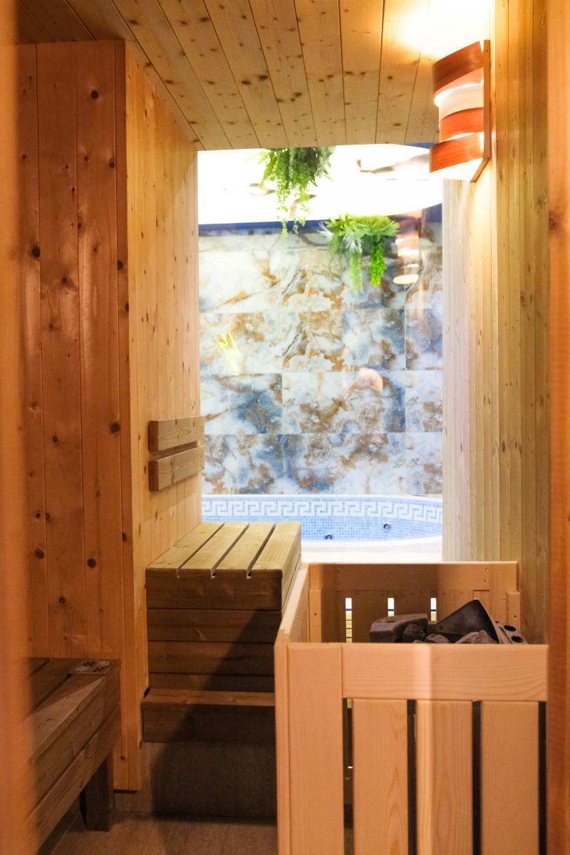 VIP zóna s podlahovým topením, saunou, výhledem na bazén