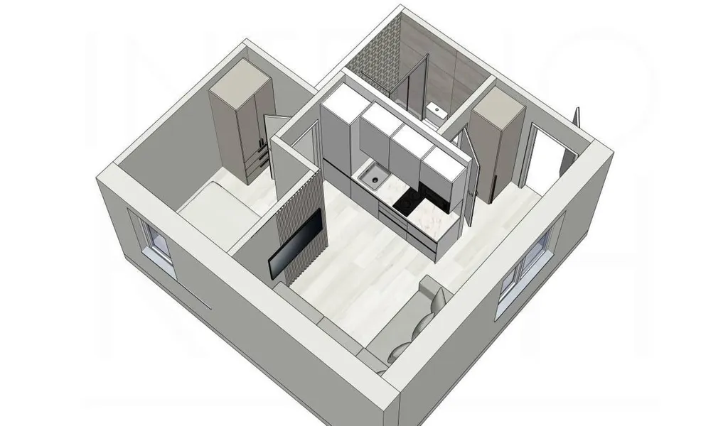 Byt je kompletně vybaven nábytkem i kuchyňskou linkou. Dispozice je prakticky řešená obývací pokoj s kuchyňským koutem, ložnice, koupelna se sprchou a WC.