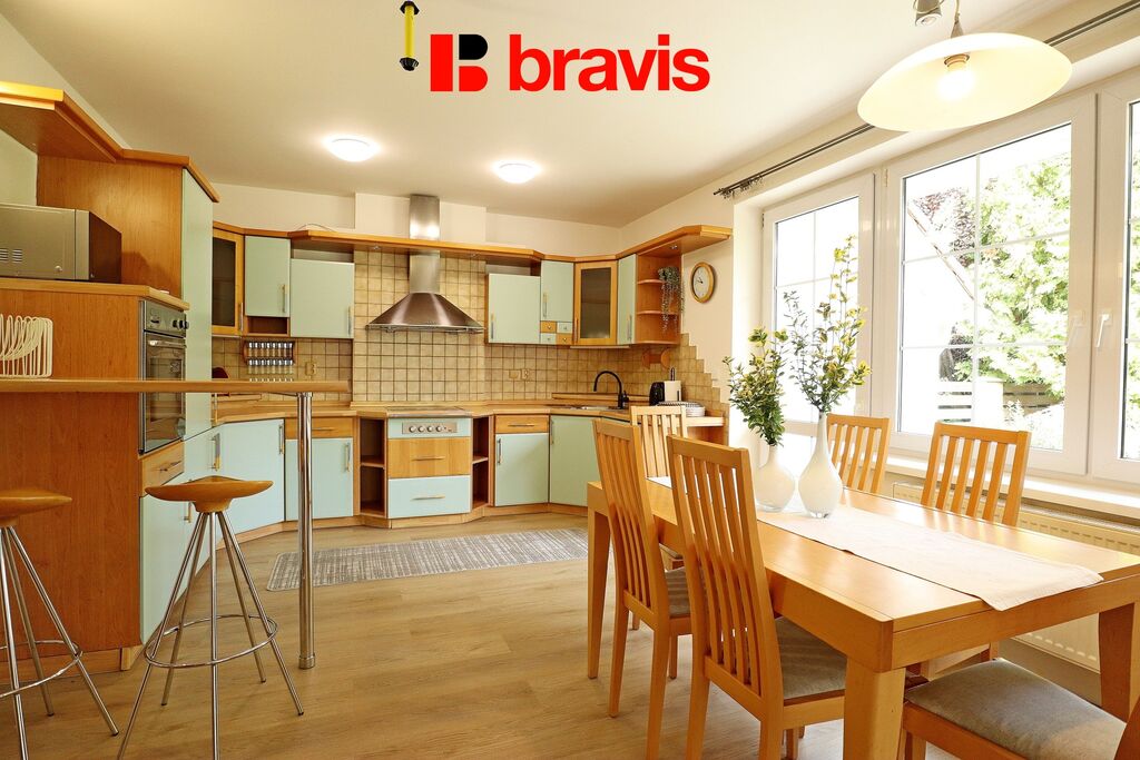 Kuchyně je vybavena kvalitní kuchyňskou linkou s moderními spotřebiči, jako je sklo-keramická deska, trouba, myčka, prostorná lednice s mrazákem, digestoř a mikrovlnná trouba. Nechybí ani jídelní stůl se židlemi a barový pult. Z kuchyně můžete přímo vyjít na zahradu, což je ideální pro venkovní posezení nebo rodinné grilování.
