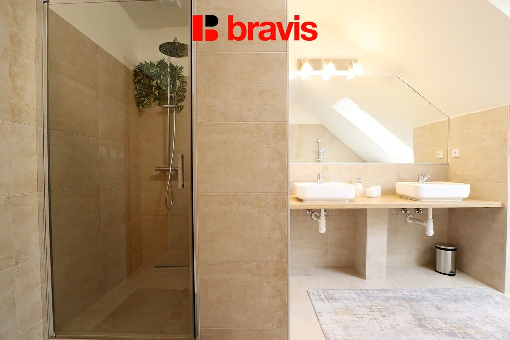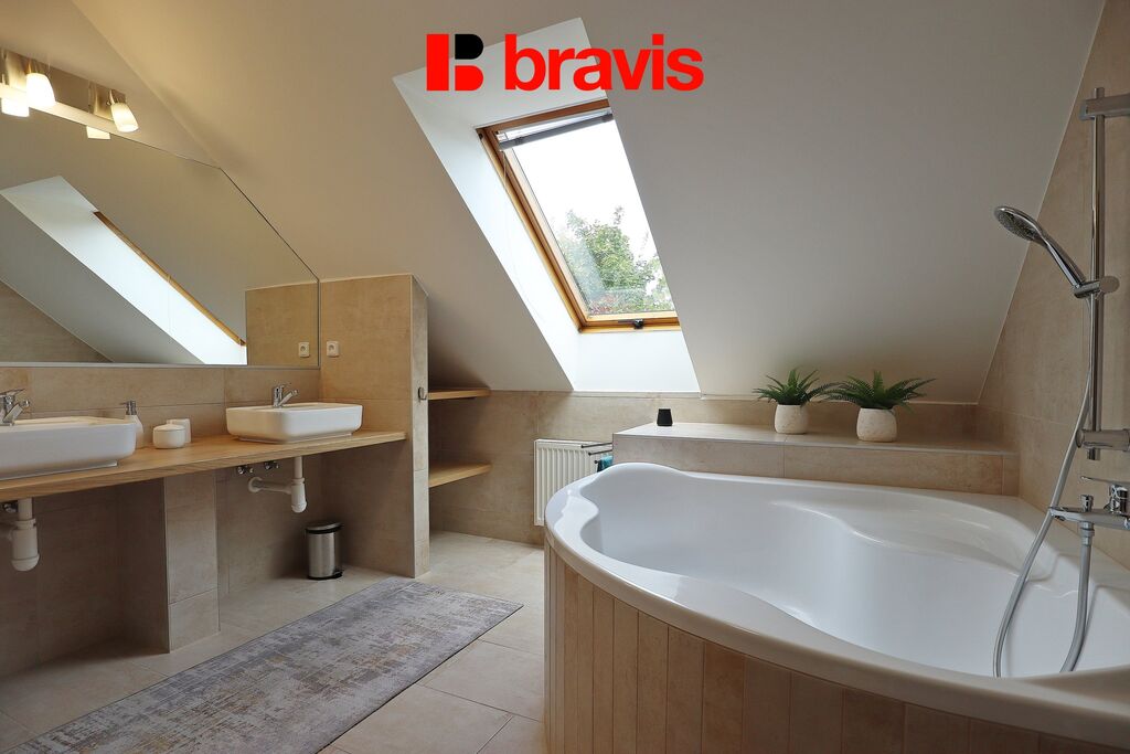 Koupelna v horním patře prošla rekonstrukcí a nabízí velký sprchový kout i vanu, dvě umyvadla a otopný žebřík.