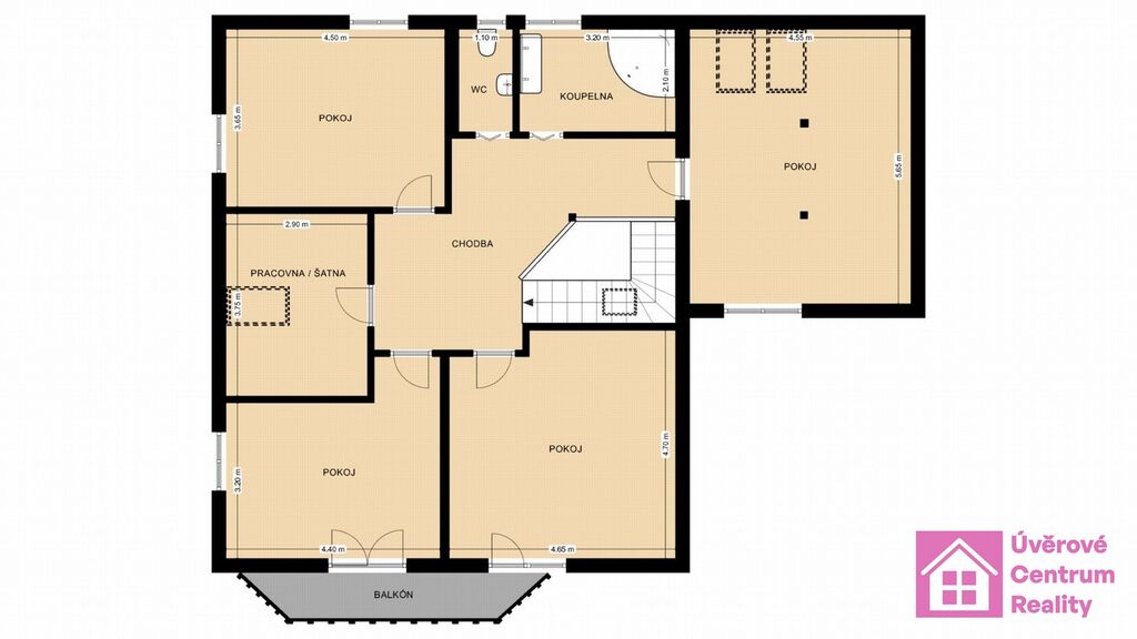 2.nadzemní podlaží: schodiště, pokoj, chodba, koupelna (vana), toaleta, pracovna a tři pokoje.