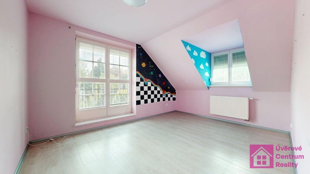 Celý pozemek domu je oplocen. Zahrada s vzrostlými stromy a krytým bazénem zajištuje dostatek soukromí. Pro Vaše děti je před domem, avšak na oploceném pozemku menší dětské hřiště.