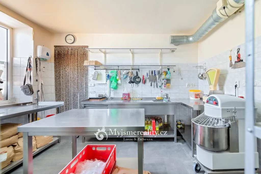 Objekt zahrnuje provozovnu s kuchyní, technickou místnost, toalety, skladovací prostory - chladicí box 20 m2 umístěný na zahradě, sklep, menší hospodářskou část a samostatnou místnost k pronájmu s vlastními měřidly vody a elektřiny. Vedle domu je pozemek vhodný pro parkování, případně další využití.