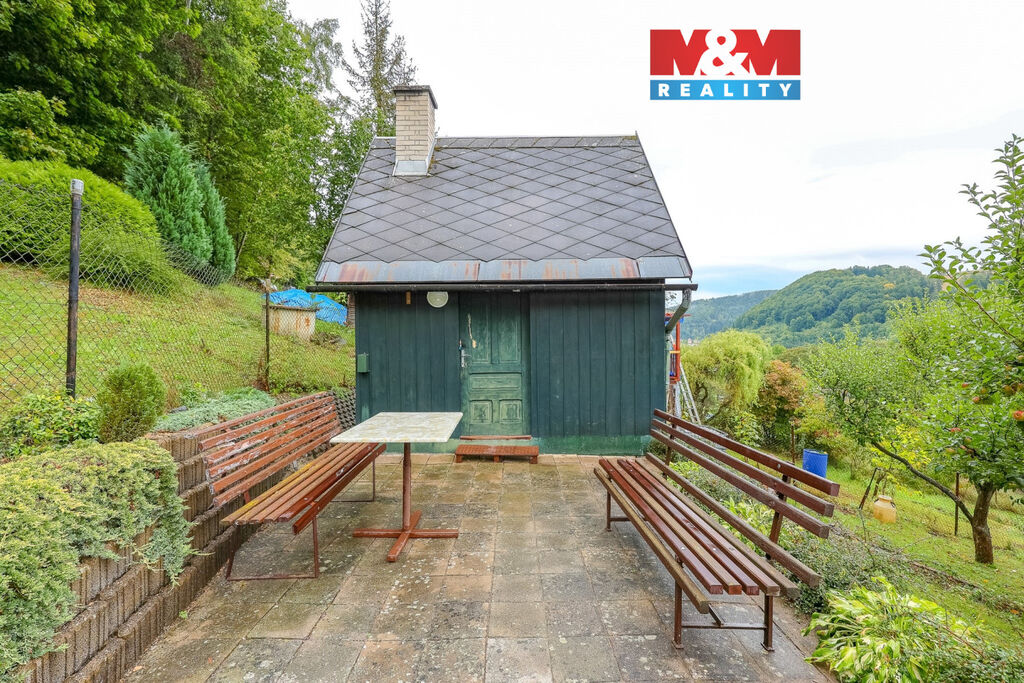 Chata nabízí dvě patra a chladný sklep pro uložení brambor či jablek, kterých je tady opravdu hodně. Horní patro je určené pro spaní a spodní patro pro společné posezení a má dobrý technický stav. Se sousedem jsou skvělé vztahy, od něj je natažená elektřina až do chaty. Buduje se nový rozvod vody. Součástí prodeje je i skleník, bouda pro uskladnění zahradních věcí a samozřejmě udírna.