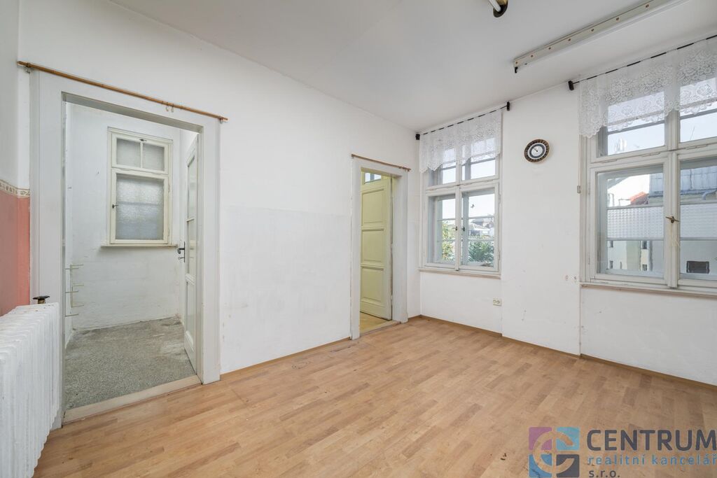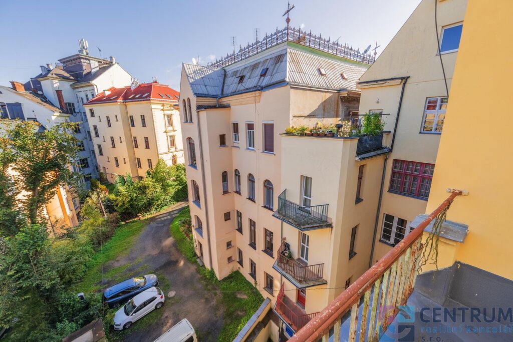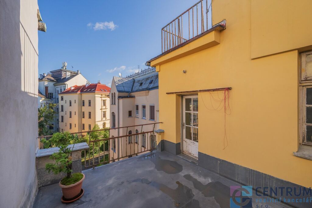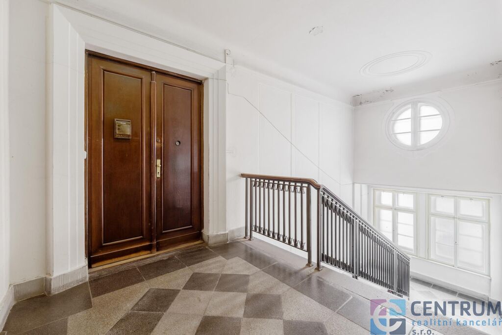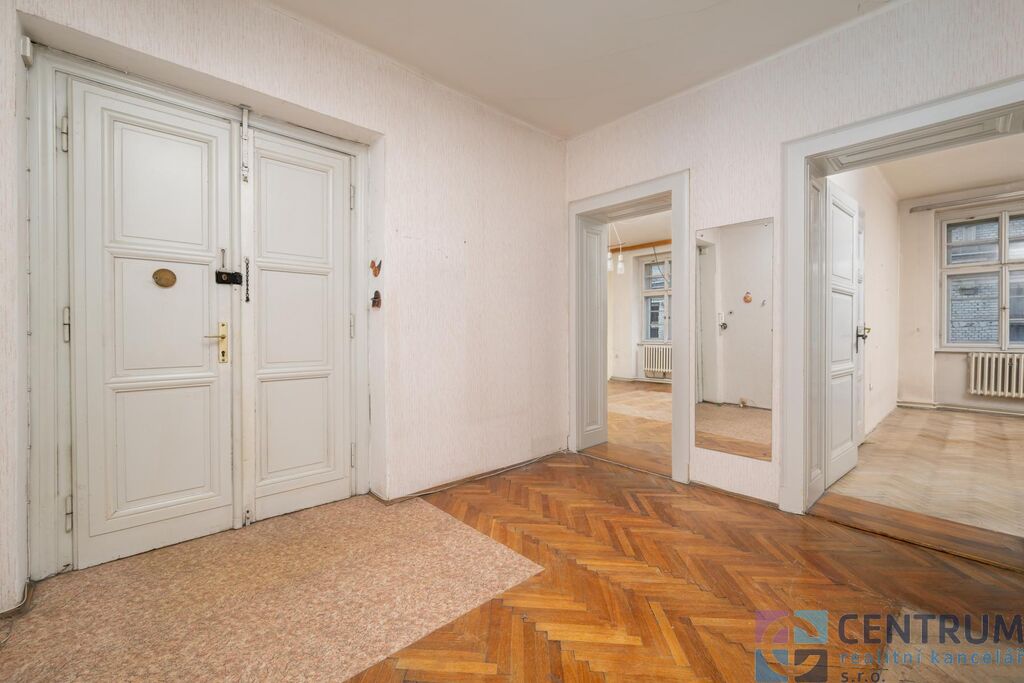Za vstupními dveřmi nás čeká prostorná předsíň, ze které je vlevo přístup do čtyř velkých pokojů s parketami a okny na jih, rovně do prostoru sociálního zázemí koupelny a samostatné toalety, kdy koupelna je přístupná zároveň z jednoho z pokojů a vpravo do kuchyně, na kterou přímo navazuje spíž a menší pracovna se vstupem na terasu. S ohledem na původní stav bytu se v rámci rekonstrukce nabízí několik variant budoucího uspořádání. Můžete ponechat luxusní 4+1, vybudovat velké 6+kk, nebo třeba 2 byty. Střešní terasa je příjemným bonusem!