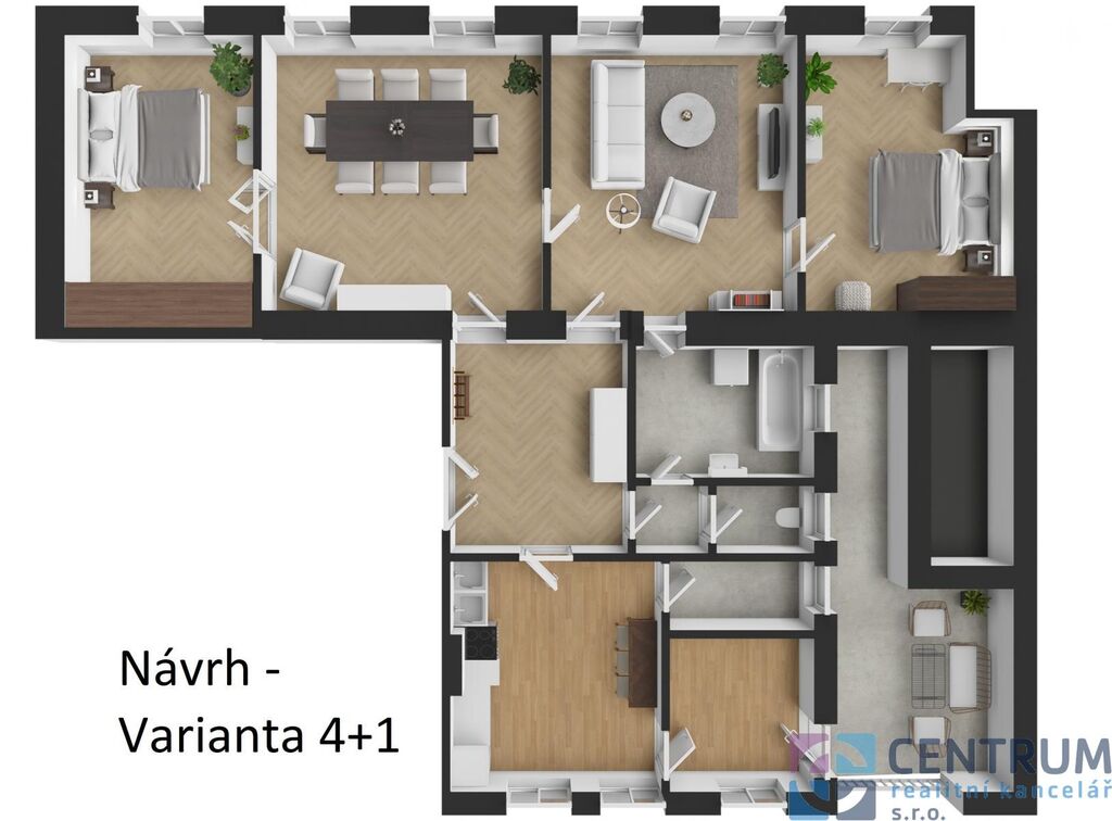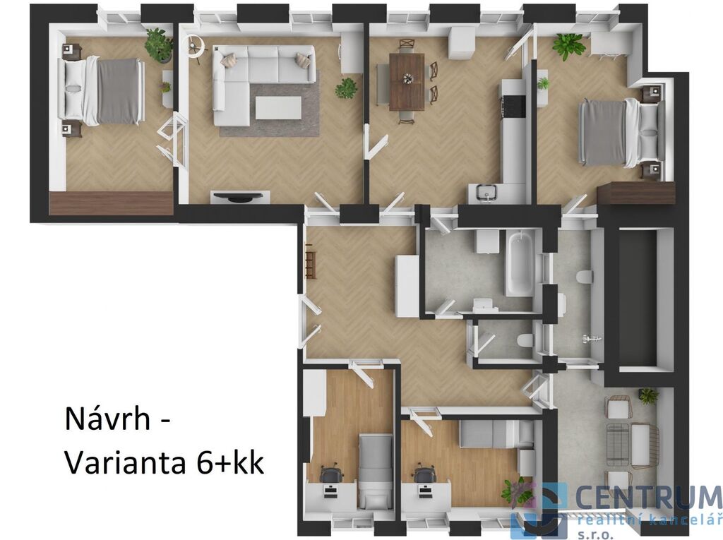 Za vstupními dveřmi nás čeká prostorná předsíň, ze které je vlevo přístup do čtyř velkých pokojů s parketami a okny na jih, rovně do prostoru sociálního zázemí koupelny a samostatné toalety, kdy koupelna je přístupná zároveň z jednoho z pokojů a vpravo do kuchyně, na kterou přímo navazuje spíž a menší pracovna se vstupem na terasu. S ohledem na původní stav bytu se v rámci rekonstrukce nabízí několik variant budoucího uspořádání. Můžete ponechat luxusní 4+1, vybudovat velké 6+kk, nebo třeba 2 byty. Střešní terasa je příjemným bonusem! S celým průběhem realizace umíme pomoci - od návrhu po dokončení - ozvěte se a zjistěte více o této možnosti!