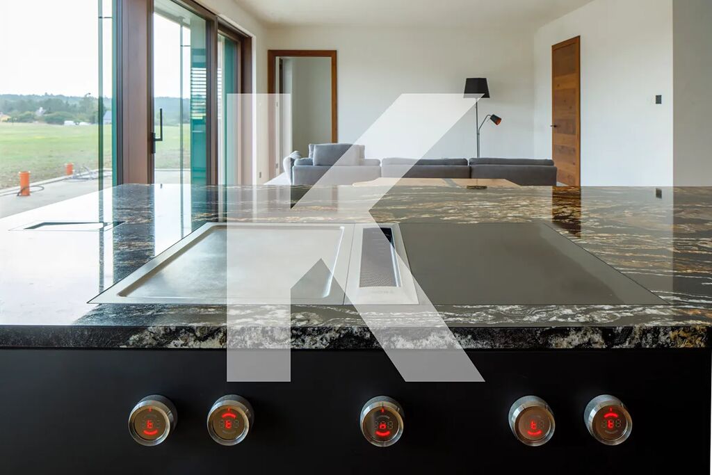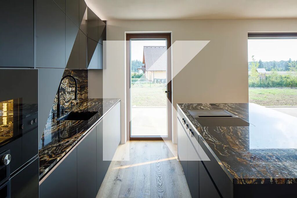 • moderní kuchyňská linka se žulovou pracovní deskou a jídelním stolem z masivu