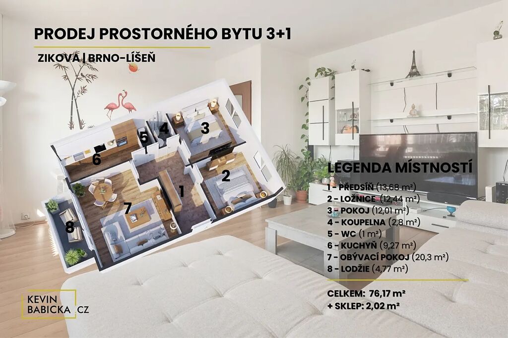 Prodej bytu 3+1, Brno, Zikova, 76 m2