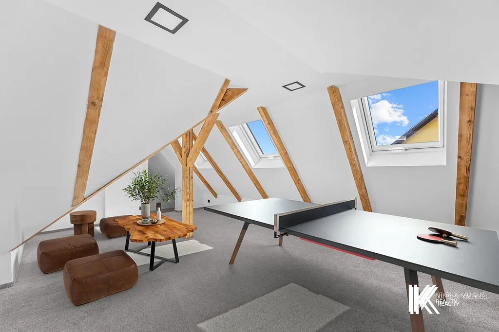 Ve druhém patře se nachází velká podkrovní místnost s odhalenými dřevěnými trámy, která prostoru dodává útulný a přirozený charakter. Skvěle poslouží jako dětský pokoj s hernou.