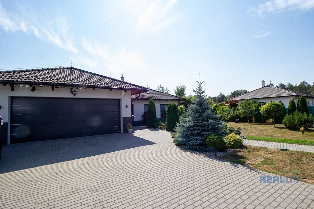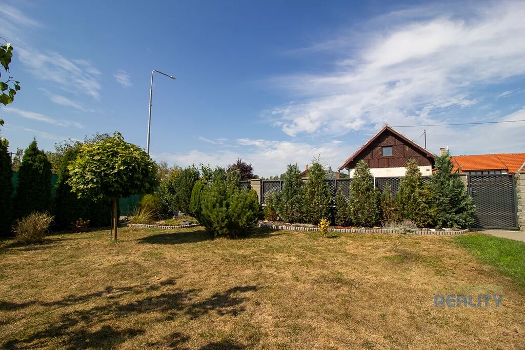 Zahrada je pečlivě udržovaná, najdete zde ovocné stromy (jabloň, třešeň), okrasné dřeviny i keře. Součástí je terasa s posezením, bazén pro letní osvěžení, zahradní domek na nářadí, přístřešek pro auto či karavan a prostorná garáž. Vjezd zajišťuje elektrická brána.