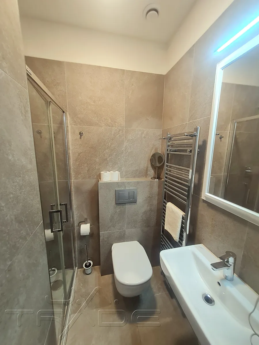 Celý apartmán se dvěma ložnicemi o podlahové ploše 50 m s výhledem na město, klimatizací, zvukovou izolací, koupelnou s vířivou vanou, sprchovým koutem, bidetem a WC, TV s plochou obrazovkou, pohovkou, ledničkou, Wi-Fi.